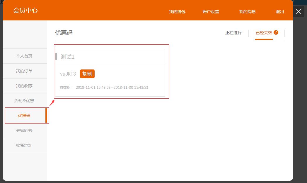 3.Pc端可在个人中心查看优惠码,如图所示: